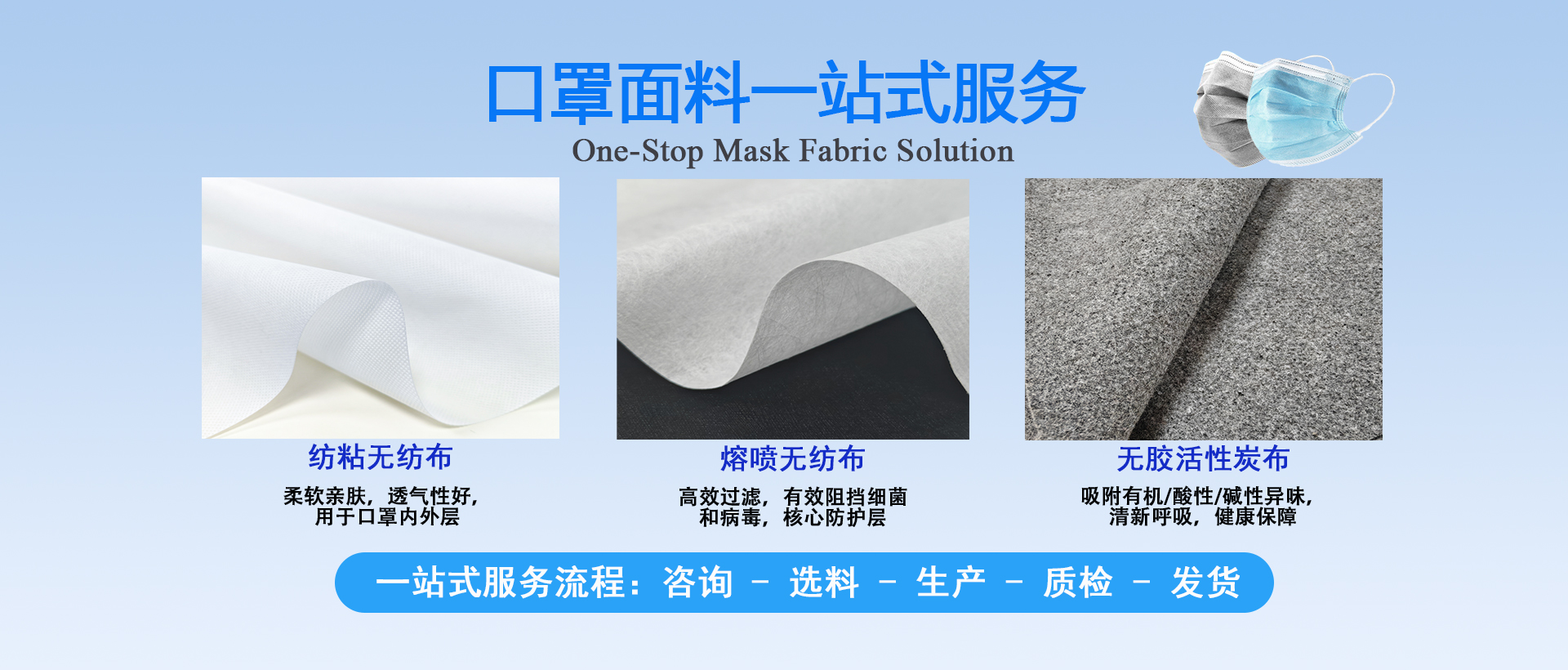擁有10萬(wàn)級(jí)凈化車(chē)間,500平方米研究生實(shí)驗(yàn)室,紡粘無(wú)紡布和水駐極熔噴布生產(chǎn)線(xiàn);年產(chǎn)布料10000噸 -